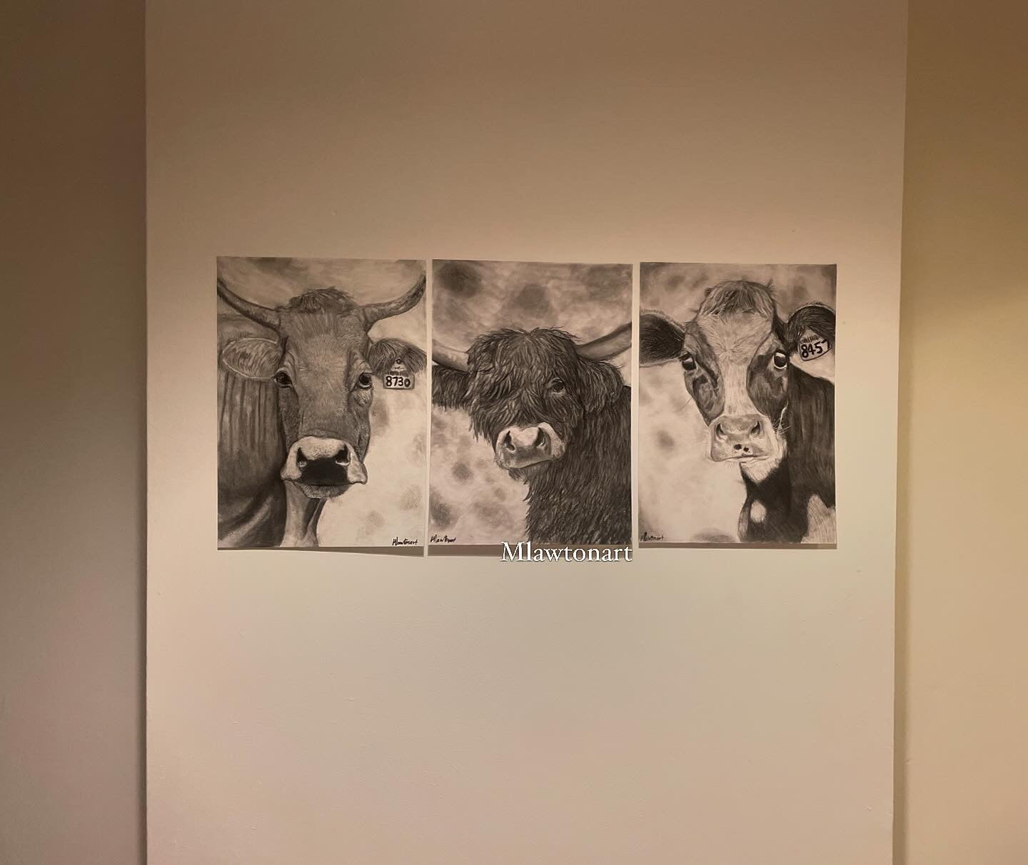 Three mixed media tonal drawings of different breeds of cows on A3 300gsm mixed media heavy paper.