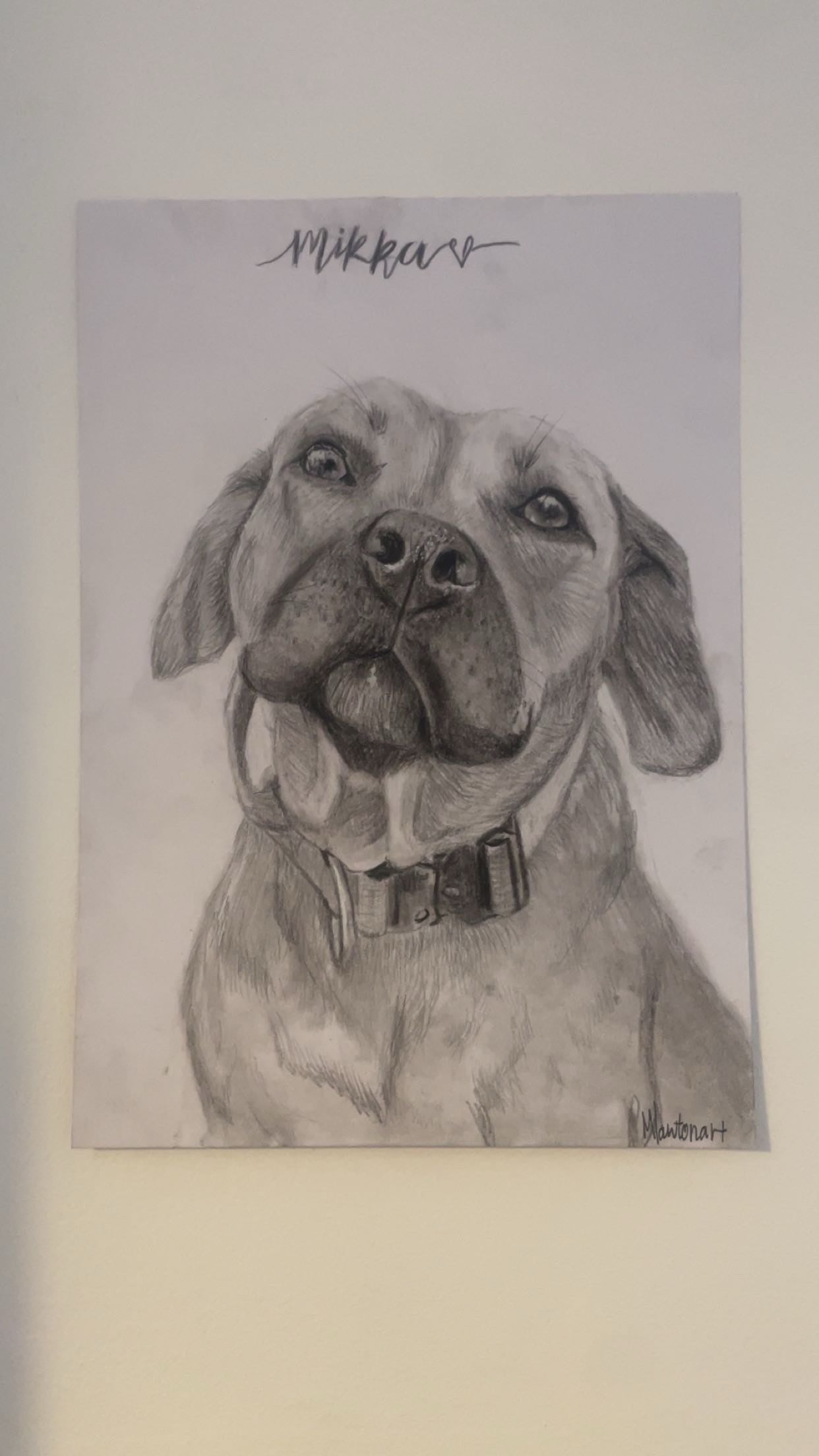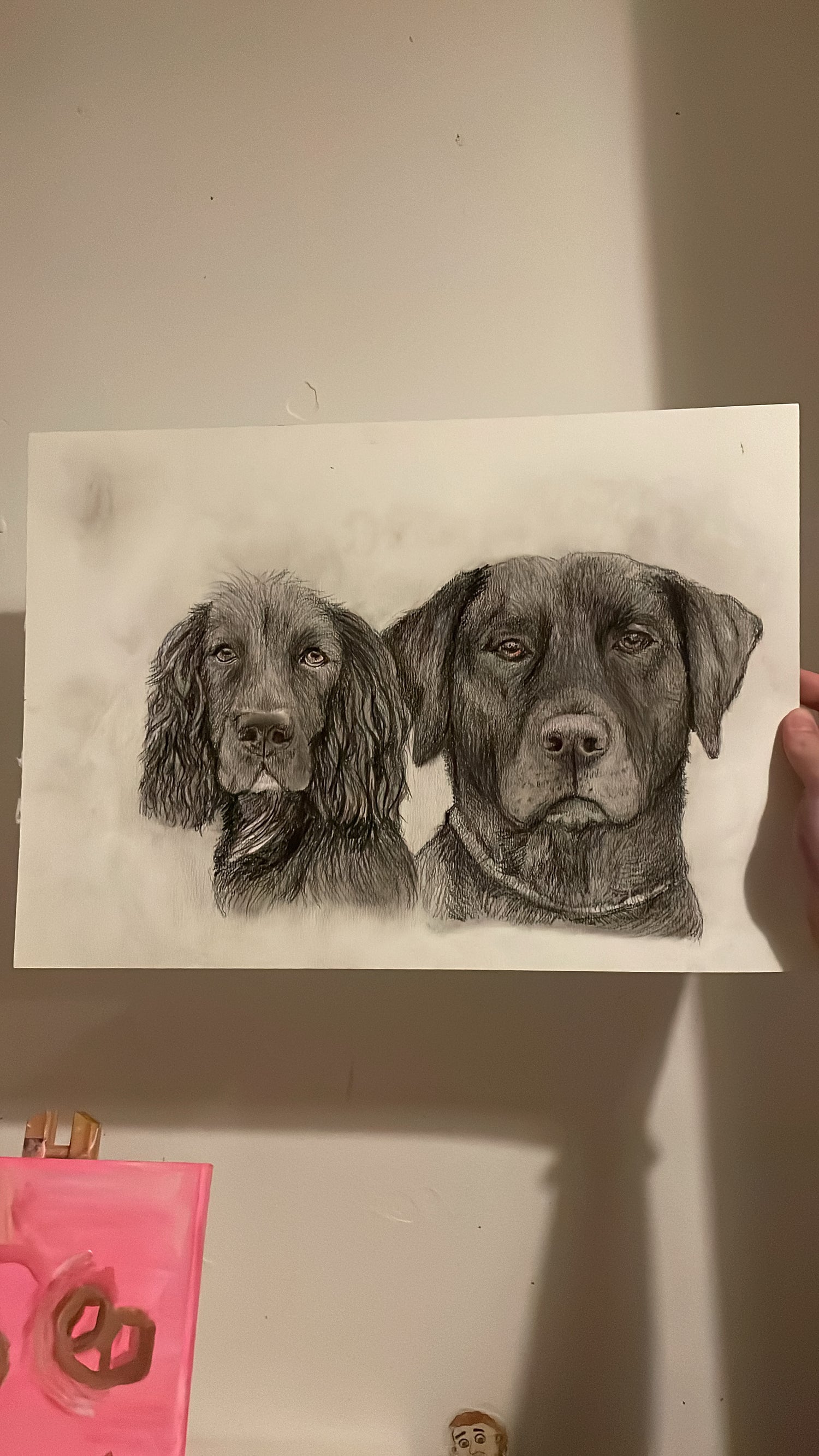 a recent pet portrait of two dogs called cash and Floyd created using graphite and charcoal pencils.